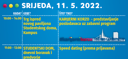 u sklopu Karijernog korza, koji će se održati 11. svibnja 2022., pružamo vam mogućnost za kratki razgovor s poslodavcima (speed-dating). Koncept speed datinga podrazumijeva kratki razgovor između studenta i poslodavca u ukupnom trajanju 8 minuta. Iskoristite prigodu za novo iskustvo intervjuiranja, prijavite se za kratki razgovor, pripremite svoje životopise i dođite u zakazano vrijeme u Studentski dom (prostor dnevnog boravka na 1. katu). Prijave su otvorene do popunjenja kapaciteta, najkasnije do 5. svibnja u 18 sati, a o točnom terminu bit ćete obaviješteni e-mailom).