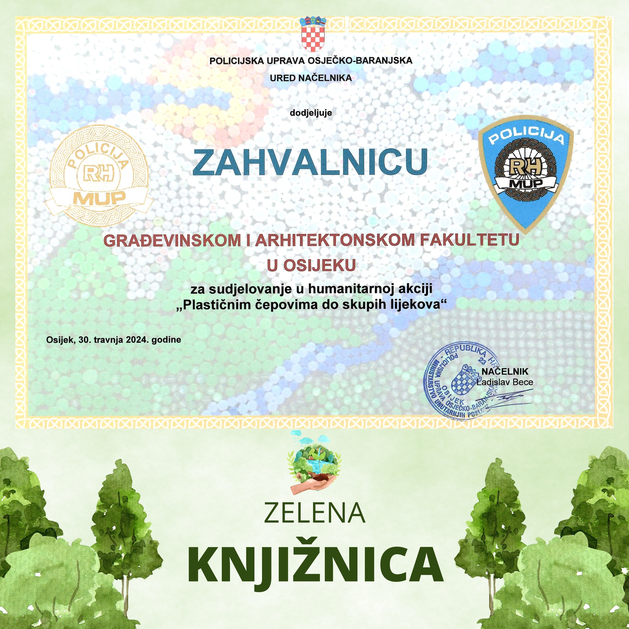 U sklopu programa Zelene knjižnice, knjižnica Građevinskog i arhitektonskog fakulteta Osijek organizira izložbe, predavanja, radionice te obilježava važne ekološke datume. U 2023. godini nastavilo se sudjelovanje u projektu pod nazivom Plastičnim čepovima do skupih lijekova.