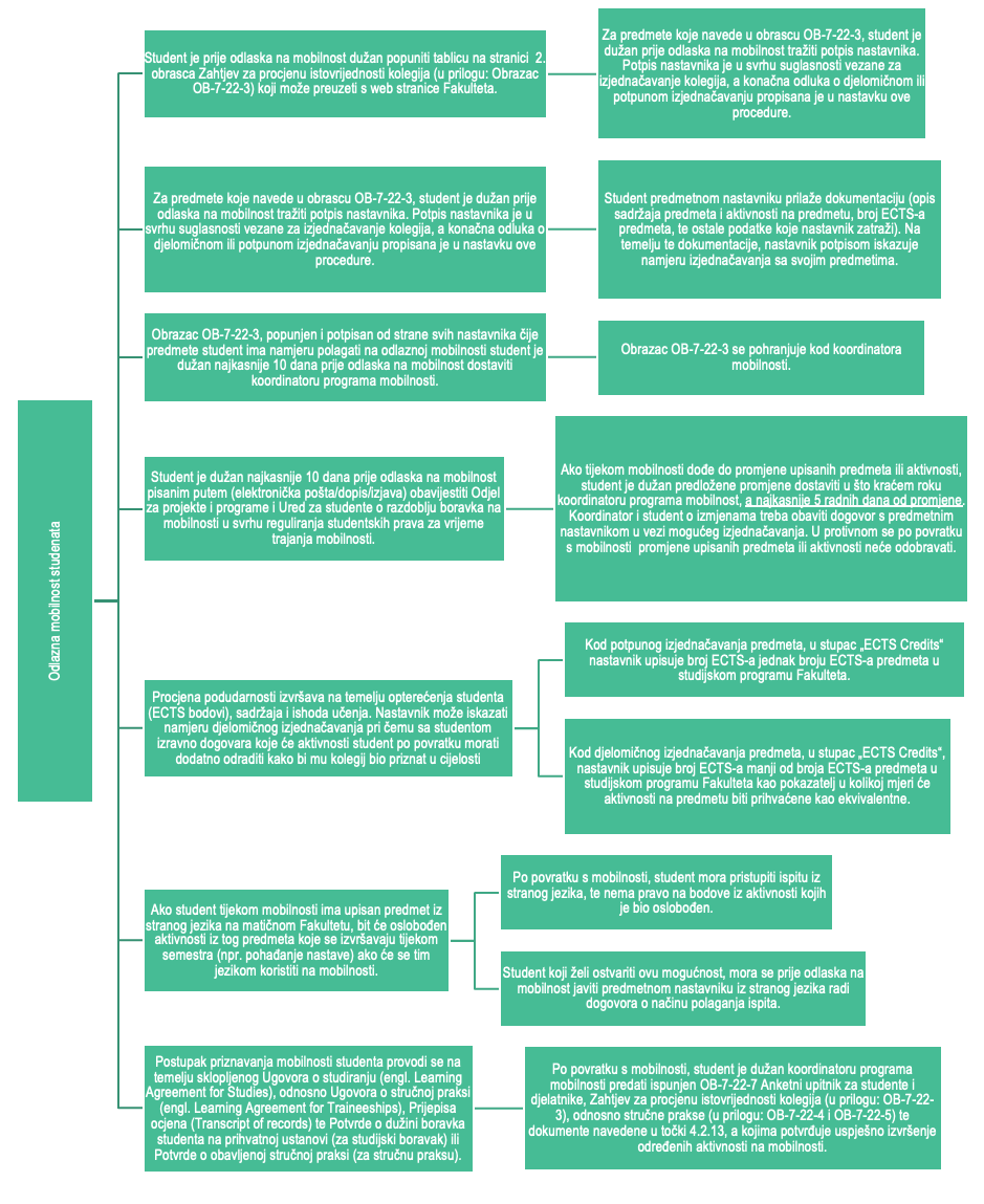 Prije odlaska na mobilnost, potrebno je javiti se studentskoj referadi i ako idete na duže vremensko razdoblje, imate opciju staviti godinu u mirovanje. Također, trebate se javiti Službi za međunarodnu i suradnju na Sveučilištu-Rektoratu barem 1 mjesec ranije kako bi vam oni mogli napraviti ugovor za financiranje. Više o tome ovdje.