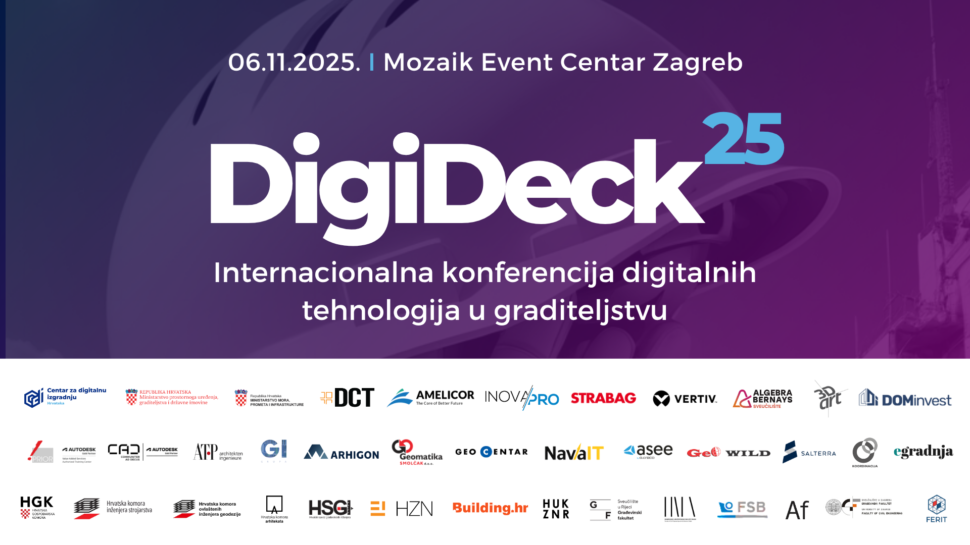 pozivamo vas na četvrto izdanje konferencije digitalnih tehnologija u graditeljstvu DigiDeck25 koja će se održati 06.11. u Mozaik Event Centru Zagreb s početkom od 09:00h čiji je pokrovitelj Građevinski i arhitektonski fakultet Osijek. Konferenciju organizira Centar za digitalnu izgradnju Hrvatska zajedno s tvrtkama partnerima kojoj je cilj promocija digitalizacije graditeljstva. Konferencija okuplja preko 20 izlagača, 20 predavača i nudi 2 radionice na temu umjetne inteligencije i BIM-a u graditeljstvu. Cjelokupan program pronađite na linku, a kartu osigurajte putem Entria. Za sve djelatnike i studente omogućili smo 15% popusta korištenjem koda 15DIGIDECK. U suradnji s Hrvatskim savezom građevinskih inženjera - HSGI, sudionicima će biti omogućeno ostvarivanje 7 školskih sati stručnog usavršavanja u području prostornog uređenja i gradnje.
